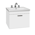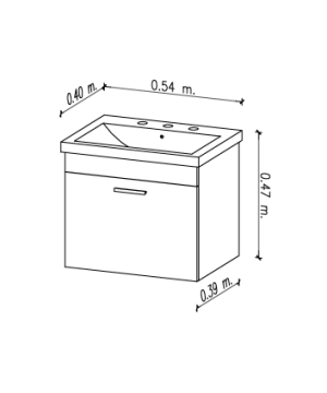 Vanitory de colgar frente laqueado blanco con 1 puerta abatible. Incluye bacha cerámica 3 agujeros. Incluye todos los herrajes de armado. Incluye herrajes para amurar contra la pared.